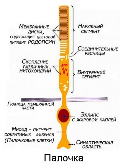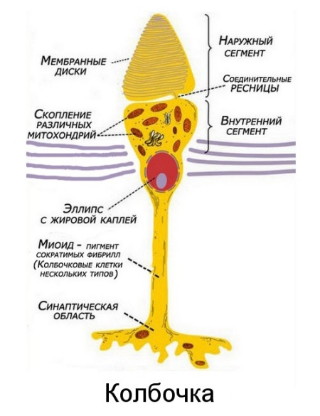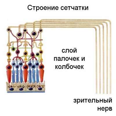 Глаз - сенсорный орган, обладающий способностью воспринимать электромагнитное излучение в световом диапазоне длин волн и обеспечивающий функцию зрения. У человека через глаз поступает около 90 % информации из окружающего мира. Колбочки и палочки - это рецепторный слой, образован светочувствительными клетками. Они воспринимают свет и превращают его энергию в нервные импульсы. В сетчатке человека насчитывают около 130 млн палочек и 7 млн колбочек.